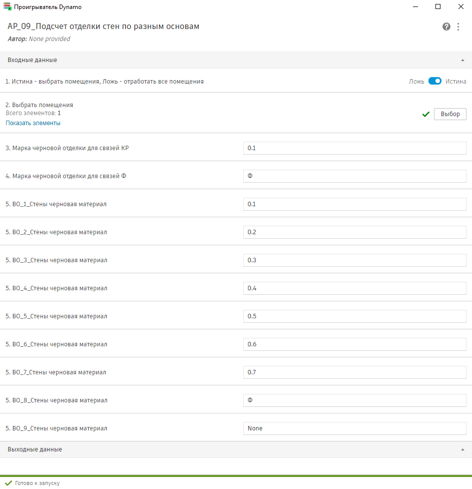 3) Необходимо заполнить параметр ВО_Стены чистовая материал в помещениях исходя из их функционального назначения. Данный параметр необходимо заполнять, так как скрипт отрабатывает только площадь чистовой отделки, привязка к материалу не предполагается.