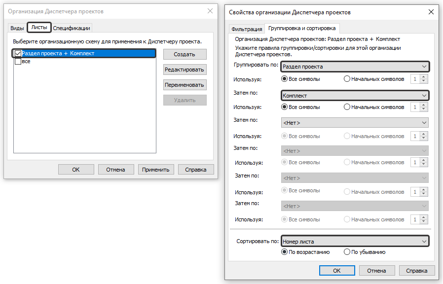 Раздел проекта + Комплект с сортировкой по Номеру листа