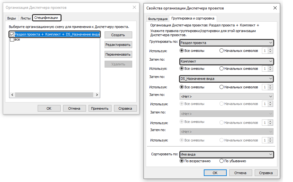 Раздел проекта + Комплект + DS_Назначение вида с сортировкой по Имени вида