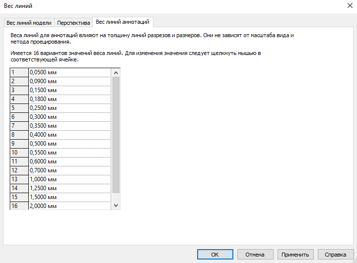 Для отображения элементов аннотаций используются веса линий из вкладки «Вес линий аннотаций».