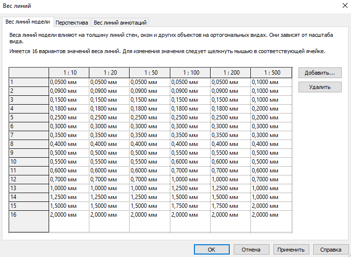 Для отображения элементов модели на планах, разрезах, фасадах, 3D – видах, используются веса линий из вкладки «Веса линий модели».