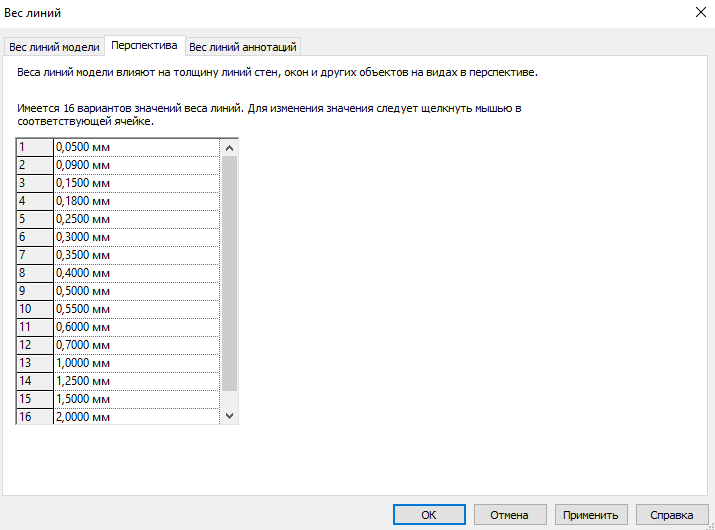Веса линий модели не используются на виде перспективы. Для перспективы используется вкладка веса линий «Перспектива».