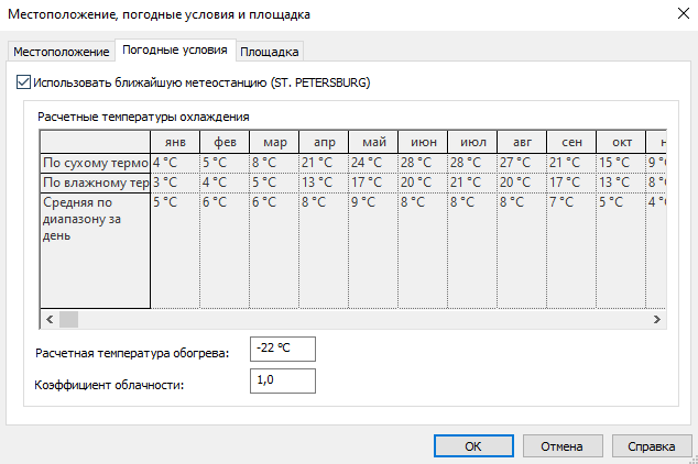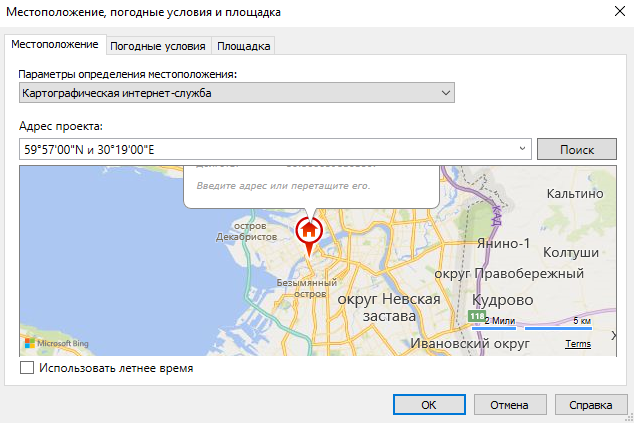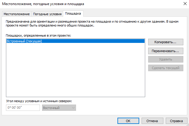 Точка съемки и Базовая точка проекта всех шаблонов находятся в системном начале координат проекта Revit. В шаблоне АР настроена одна площадка «По умолчанию» (Управление — Местоположение, погодные условия и площадка).