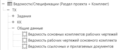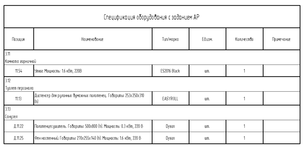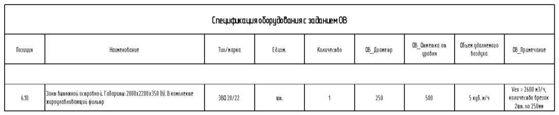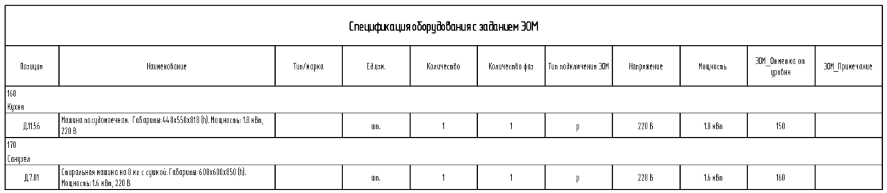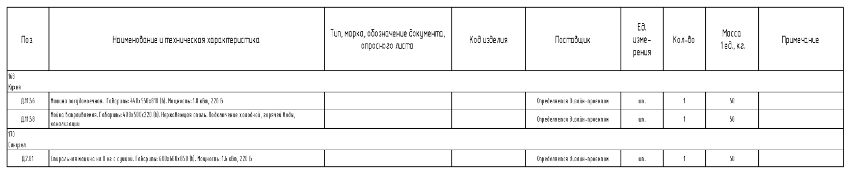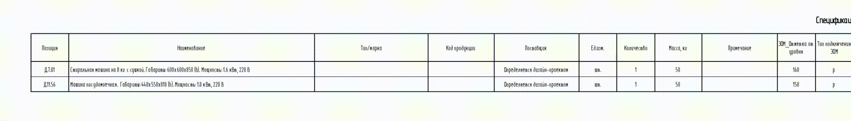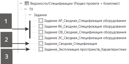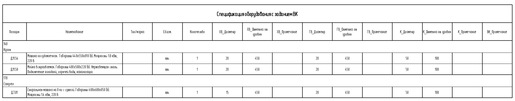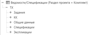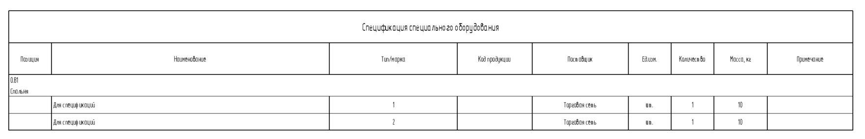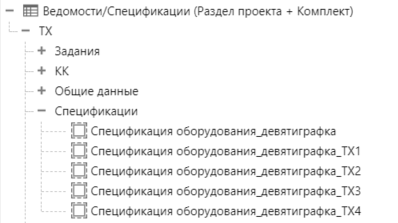 - Спецификация «Спецификация оборудования_девятиграфка», применяется на стадиях ПД/РД, включает девять обязательных граф: позиция, наименование и характеристики, тип/марка, код изделия, поставщик, ед.изм., количество, масса, примечание. Дополнительные спецификации с наименование «_ТХ1»… «_ТХ4», подготовлены с дополнительным фильтром по параметру «Комментарий».