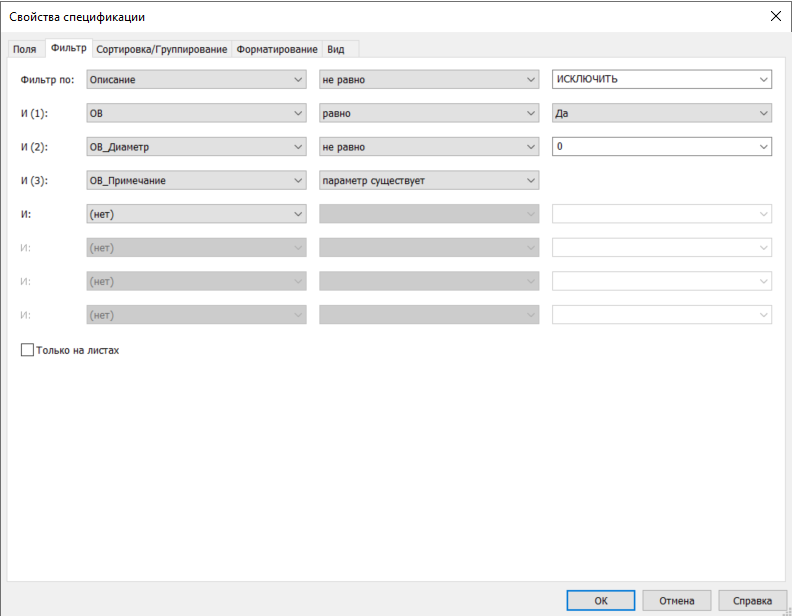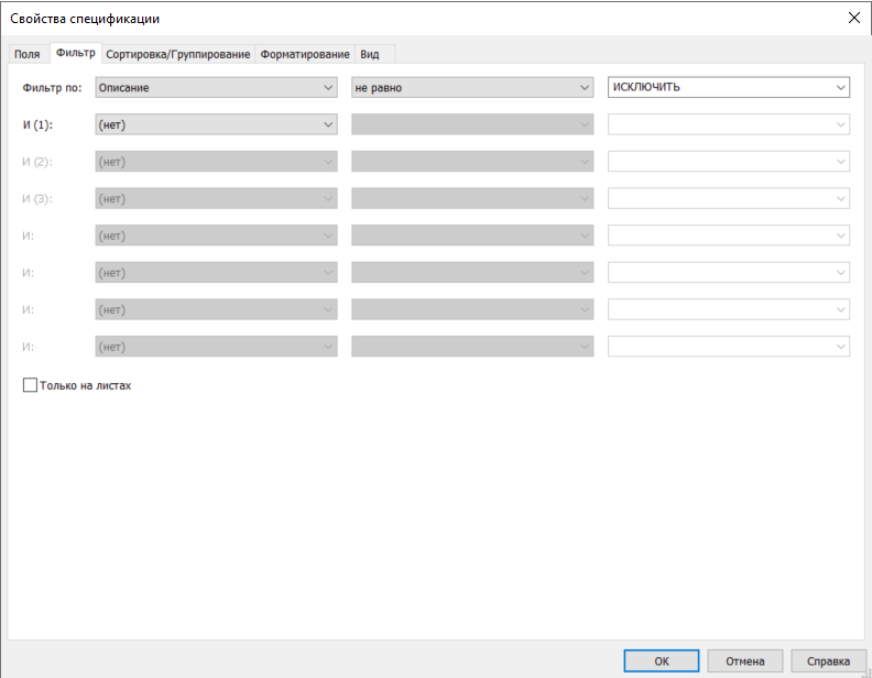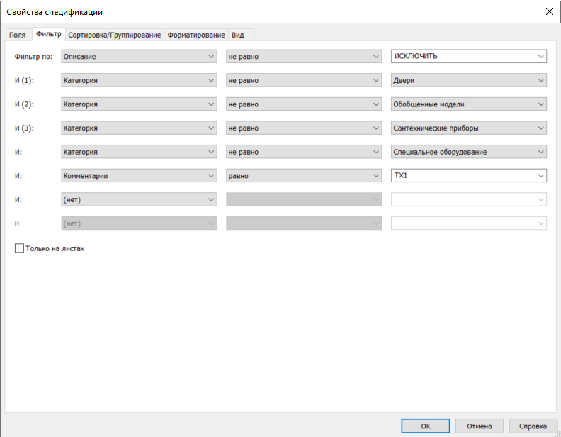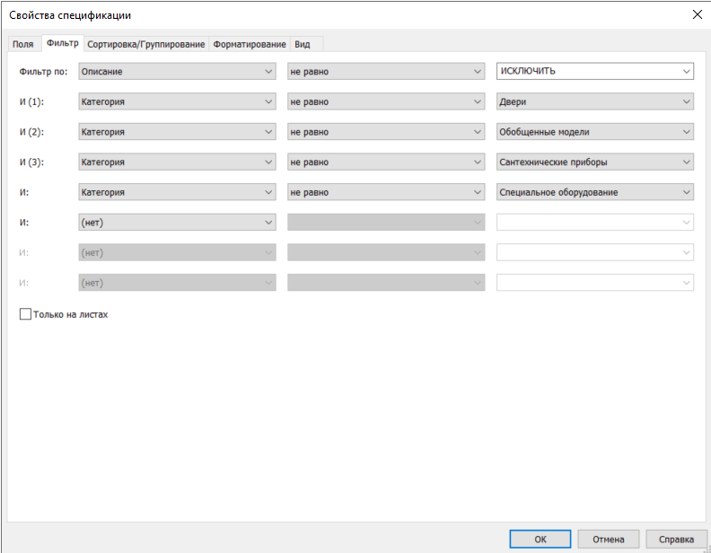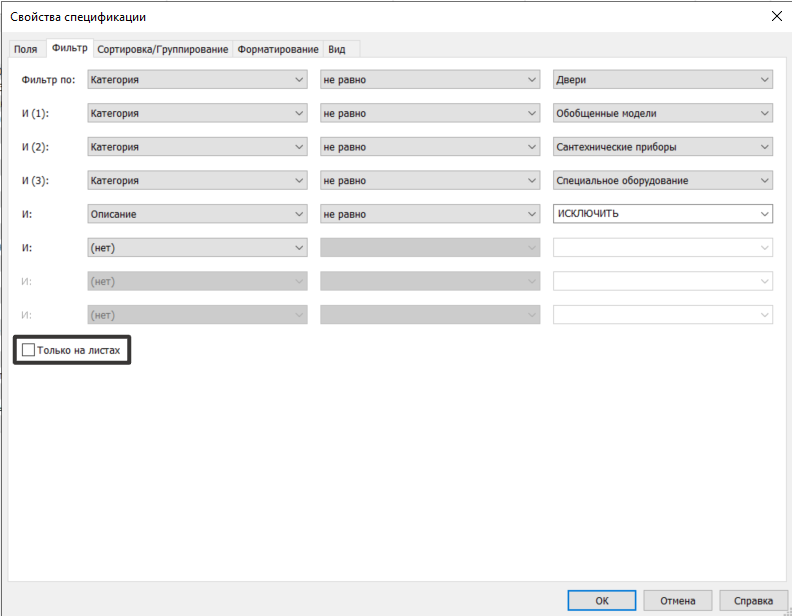 Важно: в Revit 2024 появилась возможность фильтровать элементы по листу — после размещения спецификации на листе в неё автоматически попадают только те элементы, которые присутствуют на этом листе.