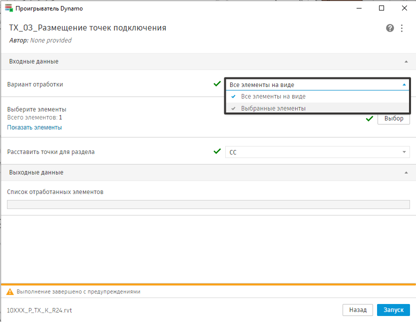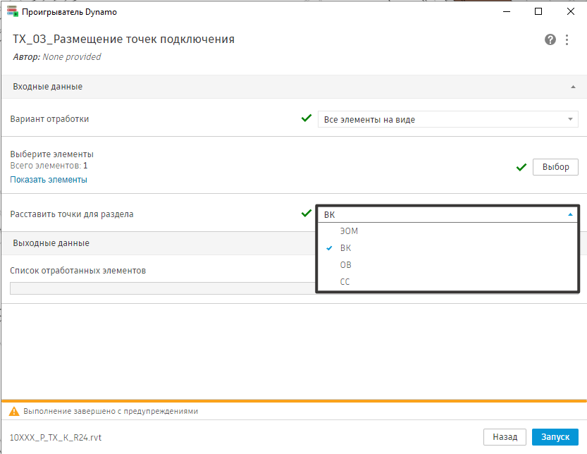 3. Запустите «Проигрыватель Dynamo» и откройте скрипт «ТХ_03_Размещение точек подключения.dyn»;
