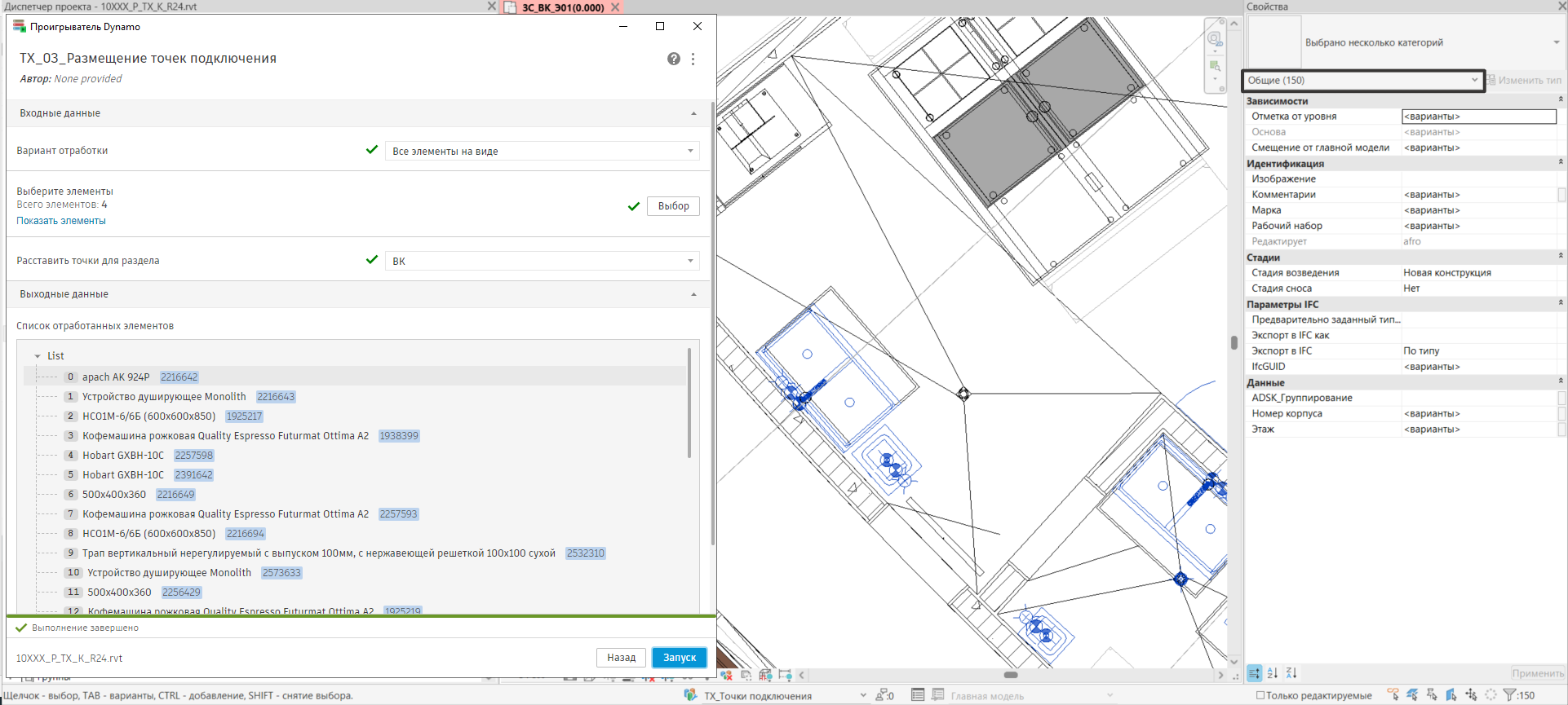 Скрипт автоматически размещает семейство обобщённой модели «ЗД_ТХ_ИОС» (точка подключения) на плане этажа на основе параметров, заданных в соответствующих семействах, которым необходимо указать точки подключения.