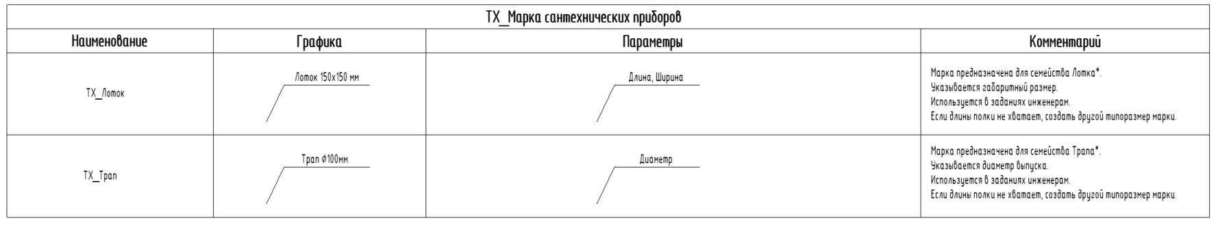 Важно: маркировка лотков и трапов выполняется с использованием семейства «ТХ_Марка сантехнических приборов», так как у этих элементов категория «Сантехнические приборы».