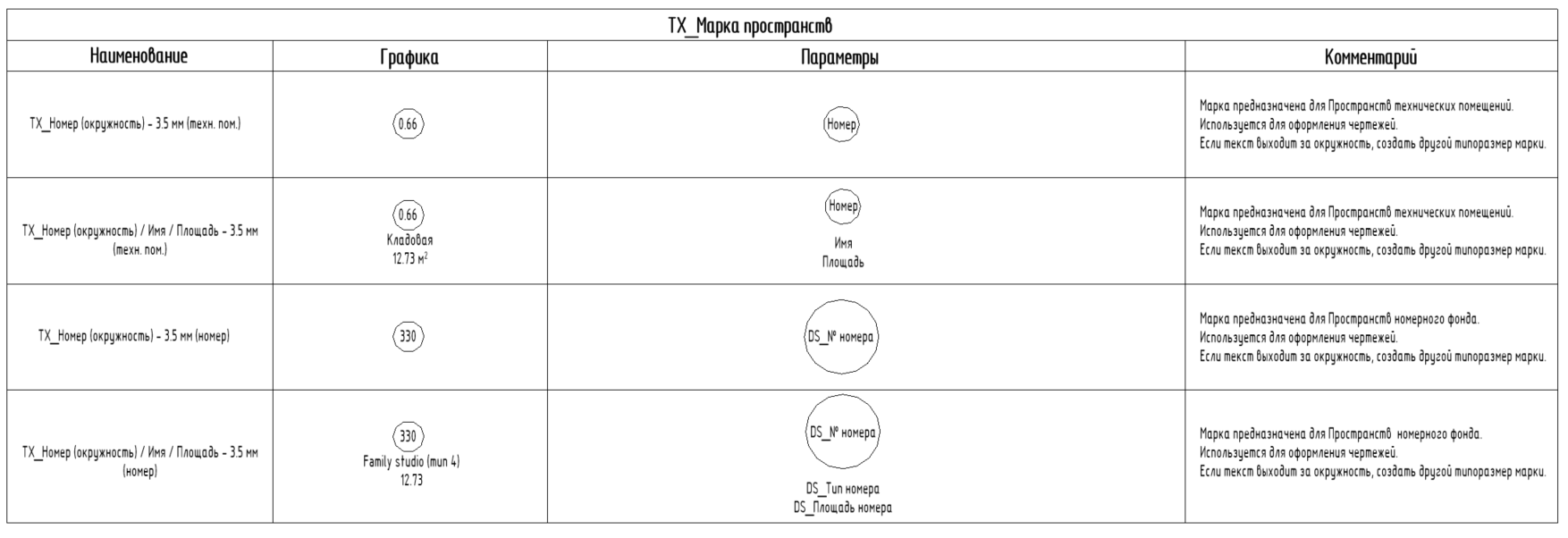 Для маркировки пространств предусмотрено семейство марки «ТХ_Марка пространств». В семействе — четыре типоразмера: два предназначены для маркировки номерного фонда и два — для технических помещений.