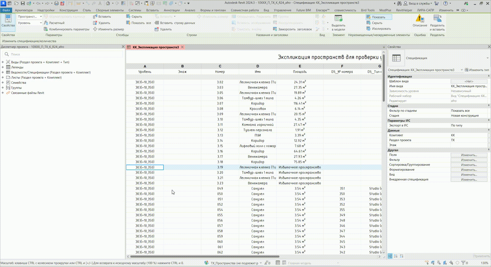 Проверочная спецификация «КК_Экспликация пространств и помещений» используется для сравнения параметров пространств ТХ и помещений АР.