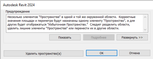 Решение: необходимо удалить дублирующее пространство из проверочной спецификации «КК_Экспликация пространств и помещений». Для этого в столбце «Площадь» найти значение: «Избыточное пространство» и удалить его.