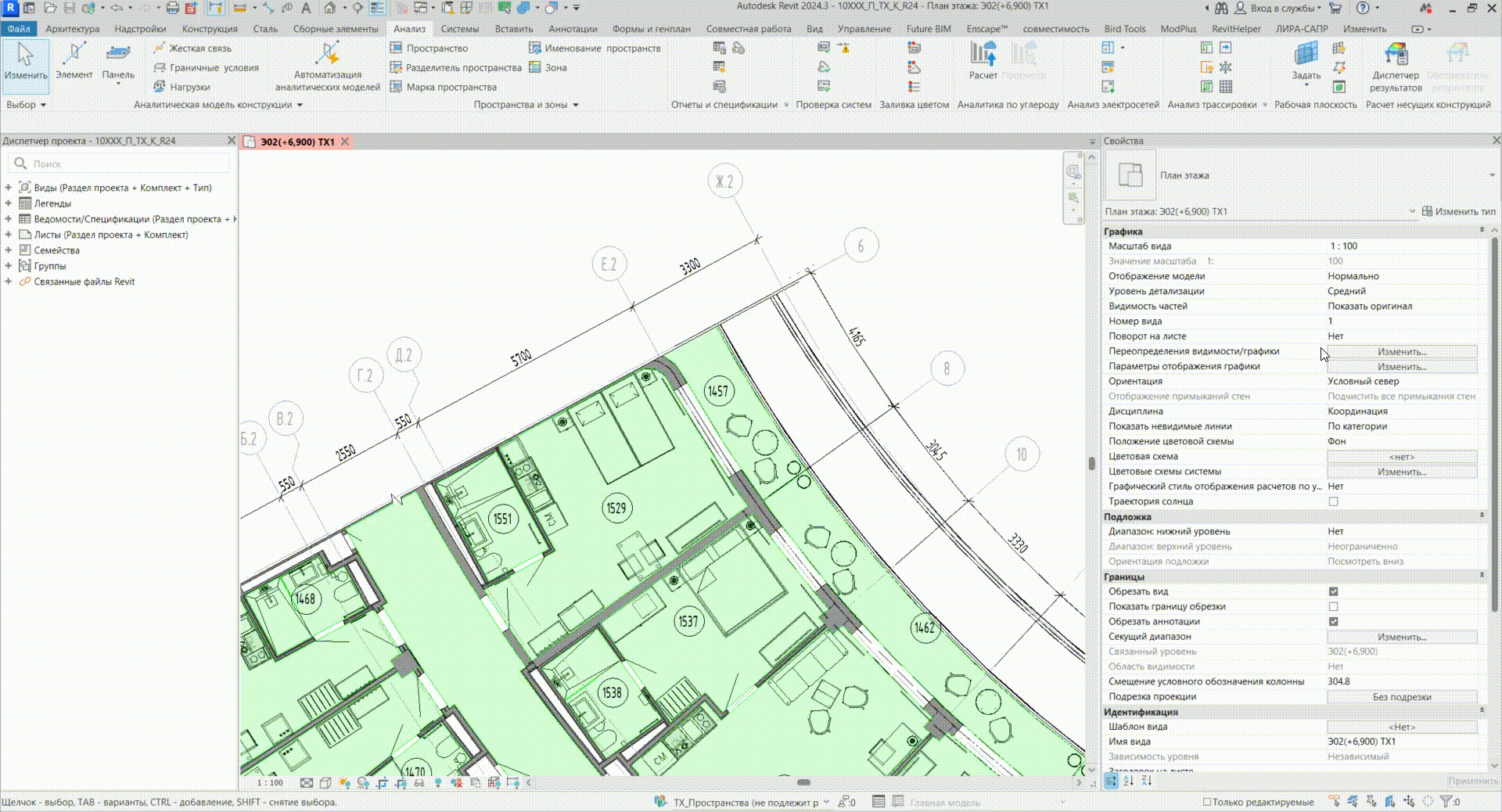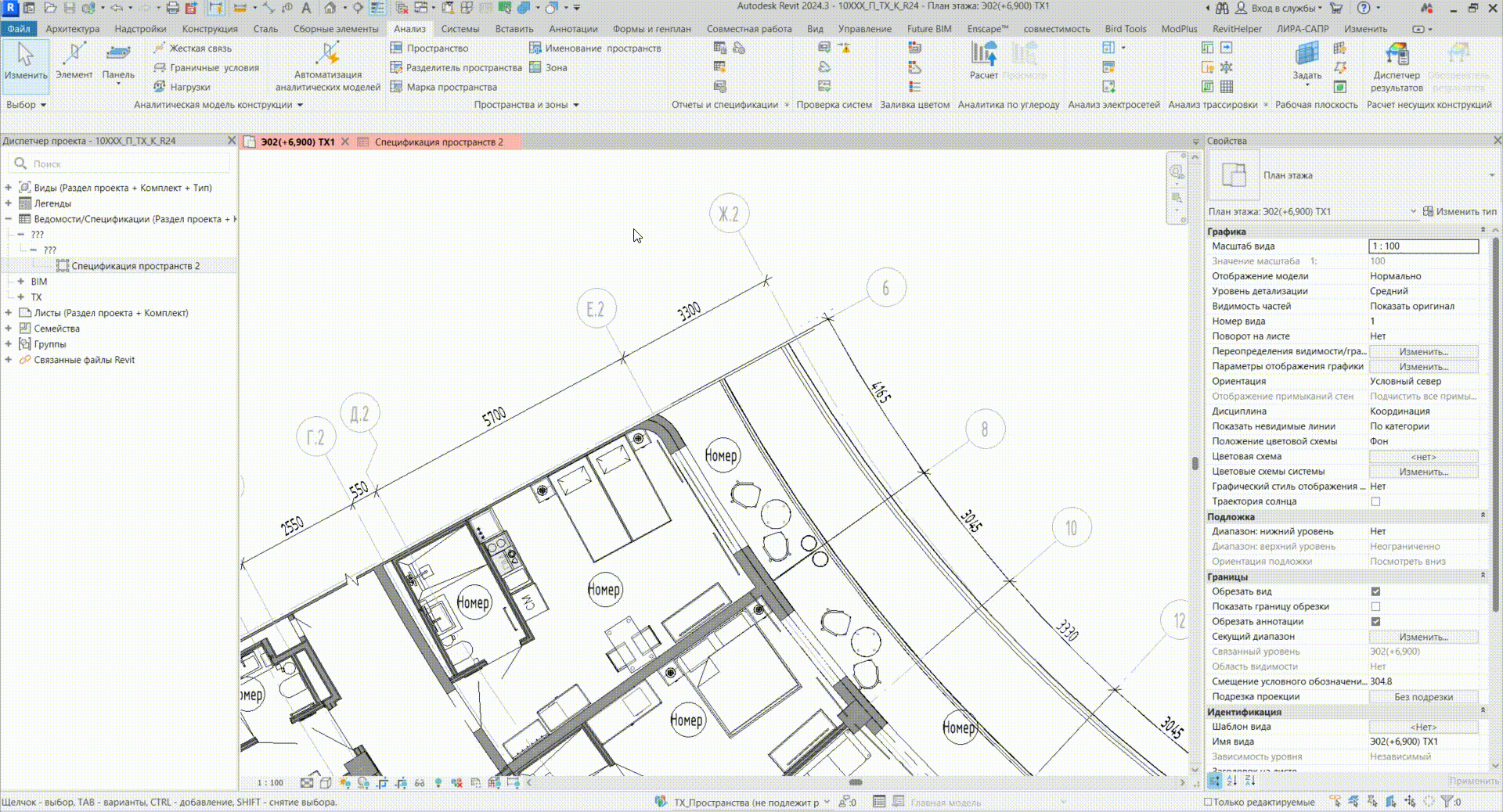 В спецификации настроен фильтр, включающий только пространства номерного фонда, с сортировкой по параметру «DS_№ номера».