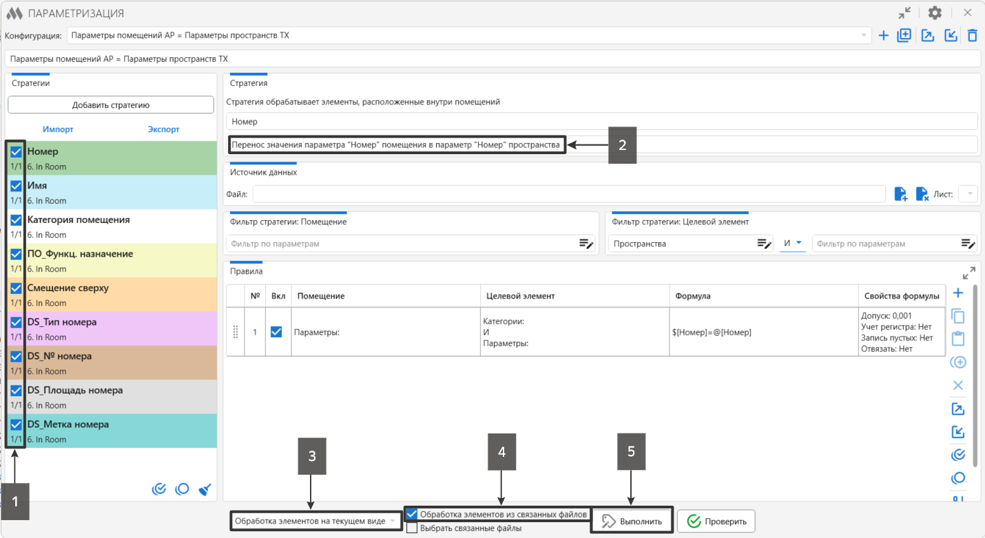 - Перенести всех необходимых значений параметров из помещений АР в пространства ТХ используйте плагин «Параметризация» от ModPlus — подробная инструкция описана в главе «Параметризация».