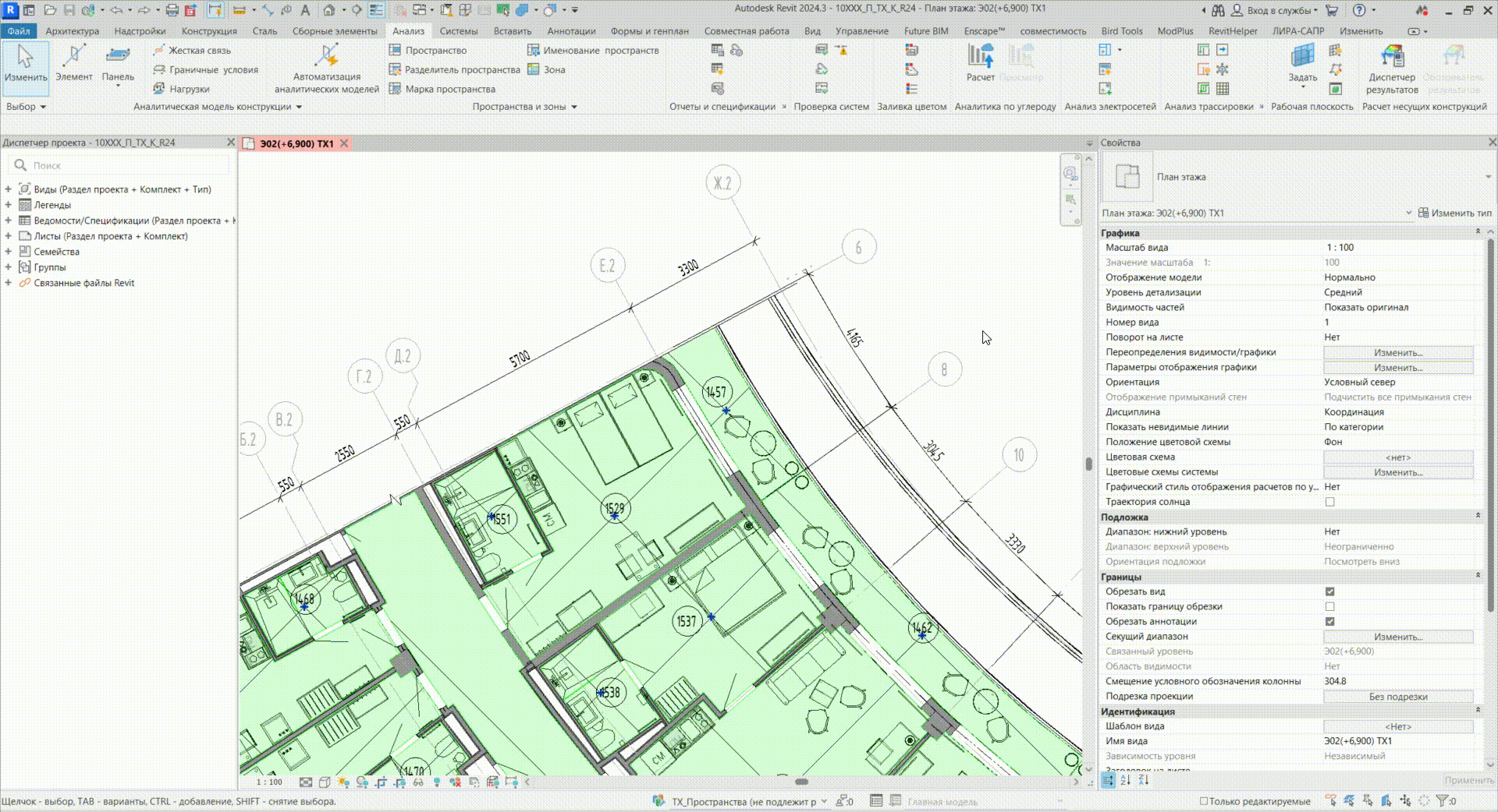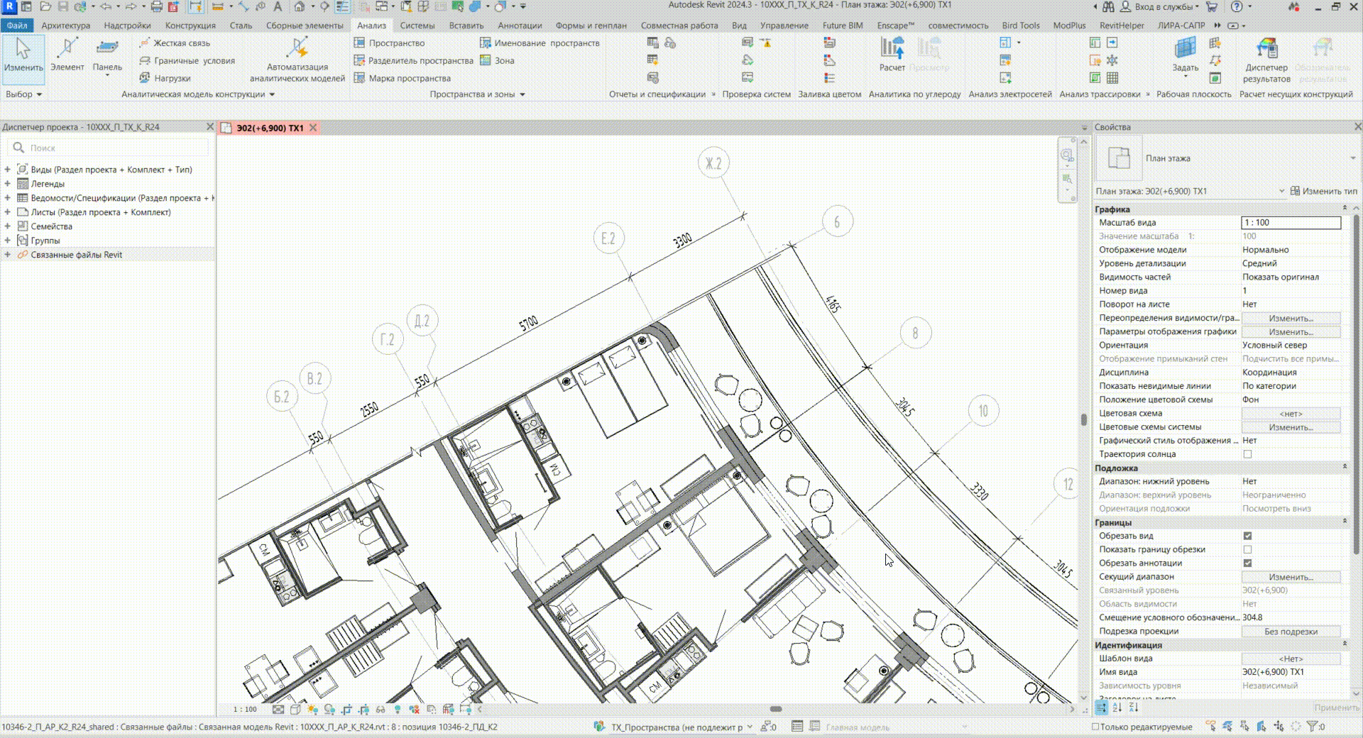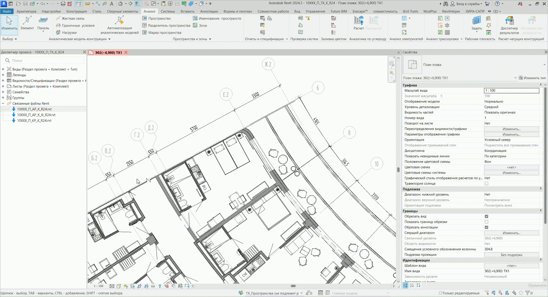 - Перед работой с пространствами, необходимо у связанных файлов АР, КР, включить галочку «Граница помещения», это необходимо для создания пространств в модели: