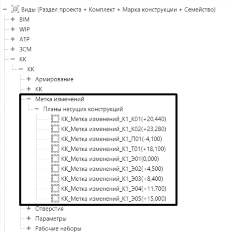 По умолчанию на всех видах видимость метки отключена. Для работы с меткой используются виды с префиксом «КК_Метка изменений».