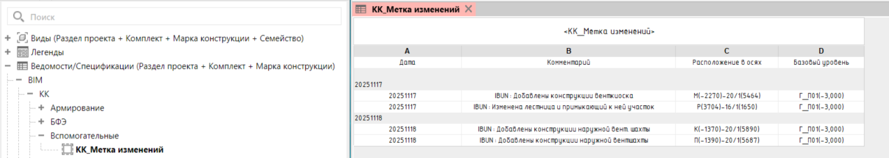 В результате расстановки меток автоматически формируется журнал изменений в модели: «КК_Метка изменений». Журнал содержит информацию о дате изменения, краткое описание изменения, расположение в осях и уровень, на котором произошло изменение.