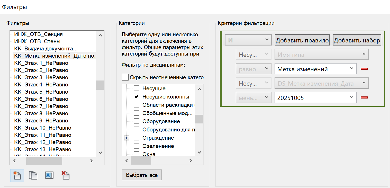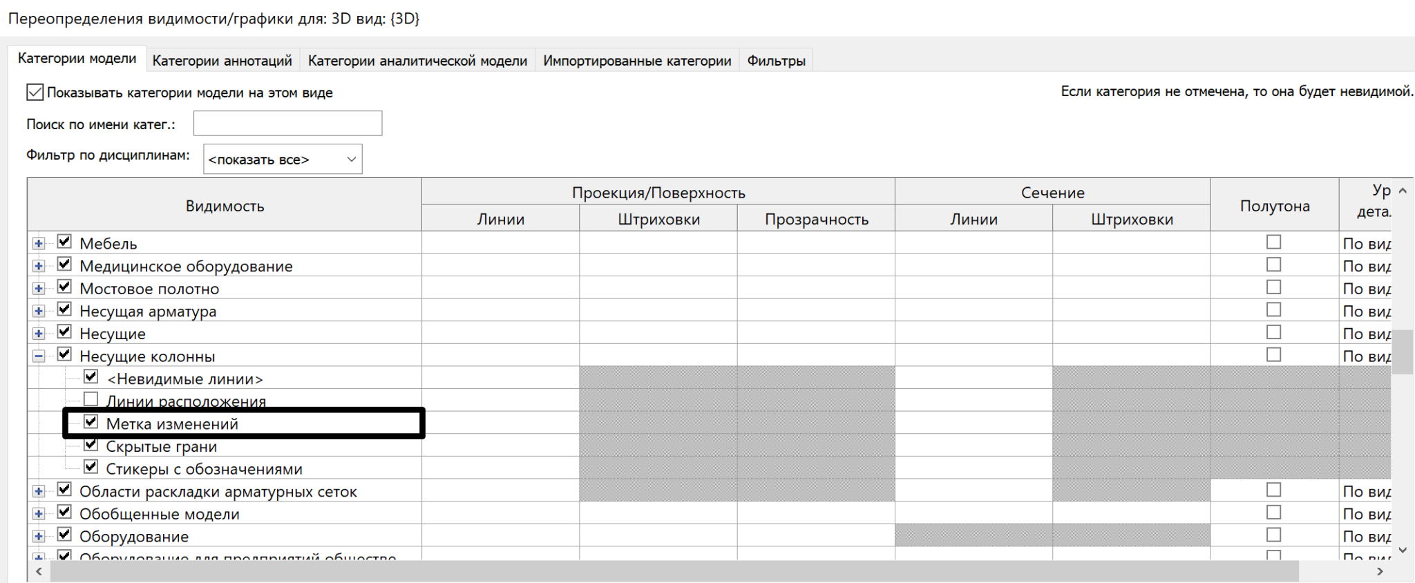 Категория Несущие колонны позволяет считывать информацию по расположению элемента относительно ближайших осей через параметр Маркер расположения колонн. Так как категория также имеет параметр Зависимость снизу, который заполняется в соответствии с уровнем. В итоге с помощью этих двух параметров, мы получаем полное пространственное положение метки изменений.
