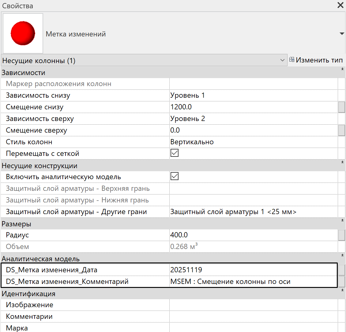 Семейство метки сделано категорией Несущие колонны. Для размещения метки необходимо на вкладке Конструкция выбрать инструмент Колонна. При размещении следует заполнить параметры DS_Метка изменения_Дата и DS_Метка изменения_Комментарий. Дата заполняется в формате YYYYMMDD (например, 20251217).