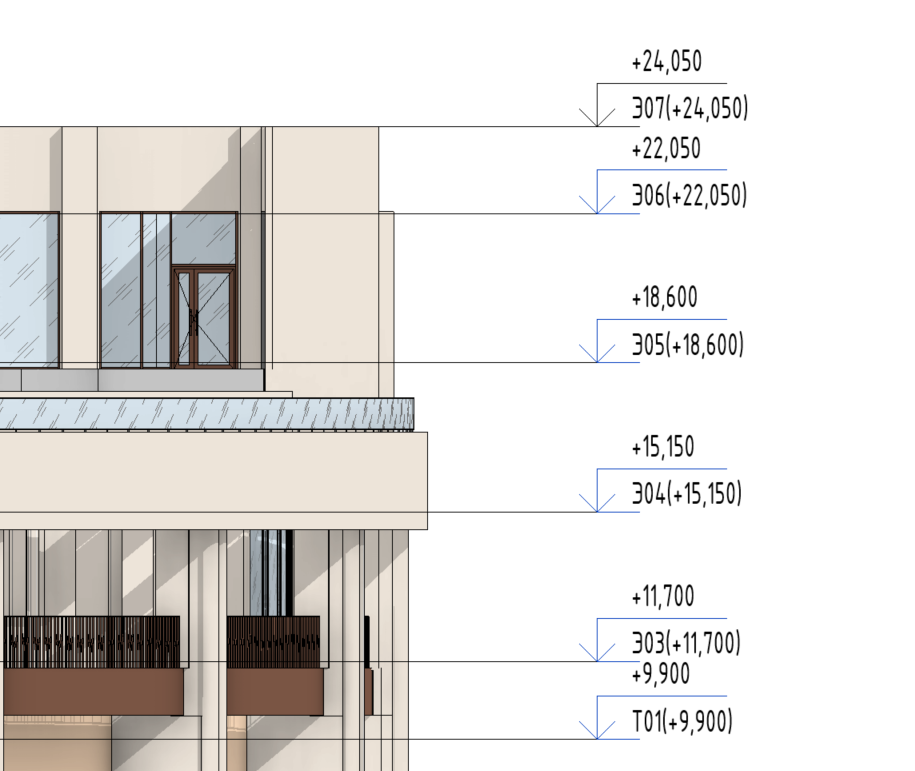 В случае деления этажа на несколько отметок, решение принимается совместно отделами АР / КР / BIM и далее решение транслируется отделу ИОС.