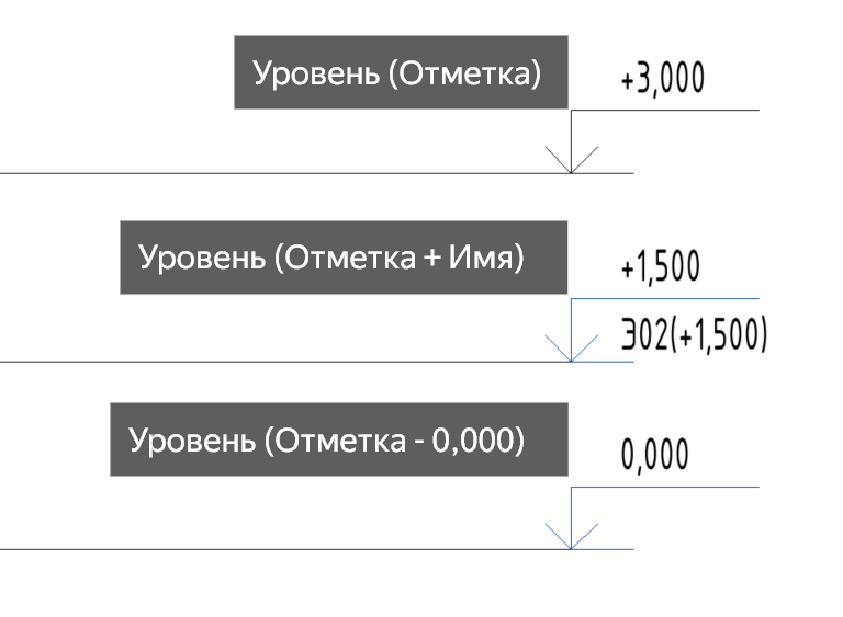 - уровень «Отметка» применяется в проекте с значениями выше / ниже уровня 0,000;