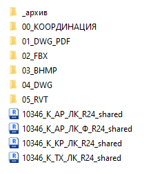 На третьем уровне хранятся уже сами модели формата rvt и в некоторых случаях nwd, относящиеся к области общих данных. Правила наименования см. раздел Правила наименования.
