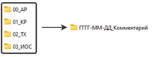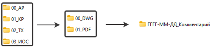Наименование папок: ГГГГ-ММ-ДД_Шифр проекта_Стадия_Раздел (если выдаются модели не по всем разделам)_Комментарий