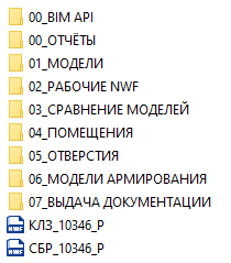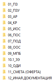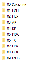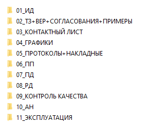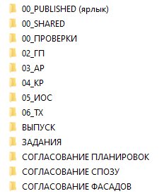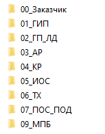 Сортируются по папкам с названием объекта, откуда взят пример, и в зависимости от тома документации. Например, «УльтраСити_Этап1_Корпус 3_ДП МОП».