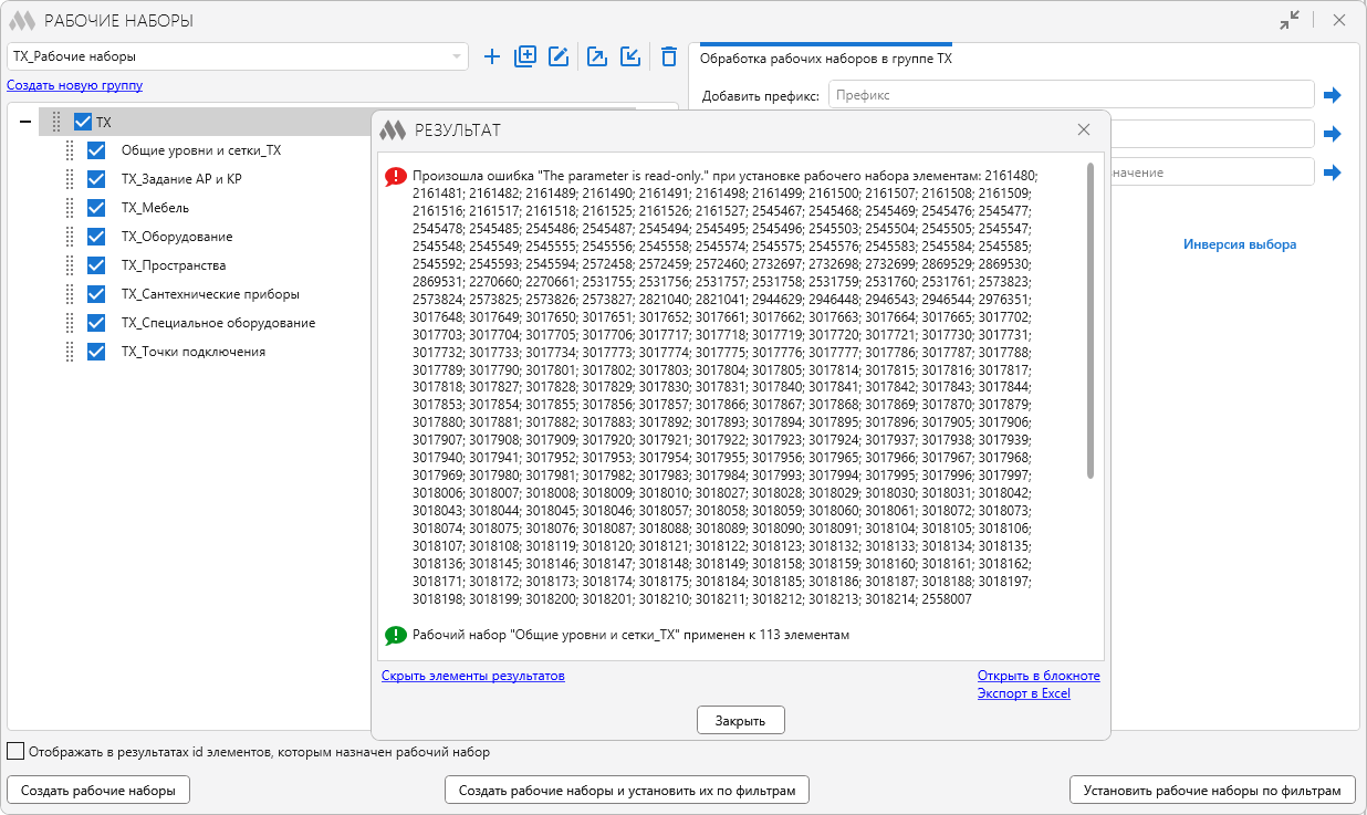 1. Если плагин выдаёт ошибку, выделите все ID элементов с проблемами и проверьте назначение рабочих наборов вручную;