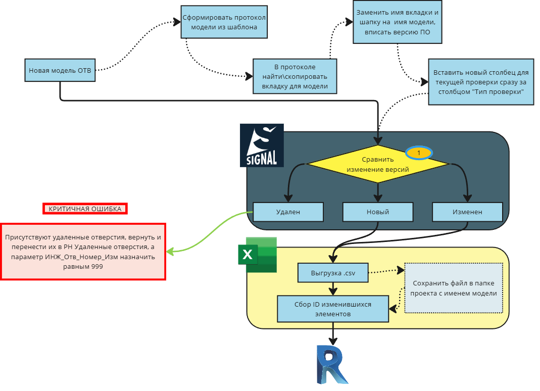 - Signal. Выполняется проверка на удаленные отверстия, сравнение версий и получение ID новых и измененных элементов.