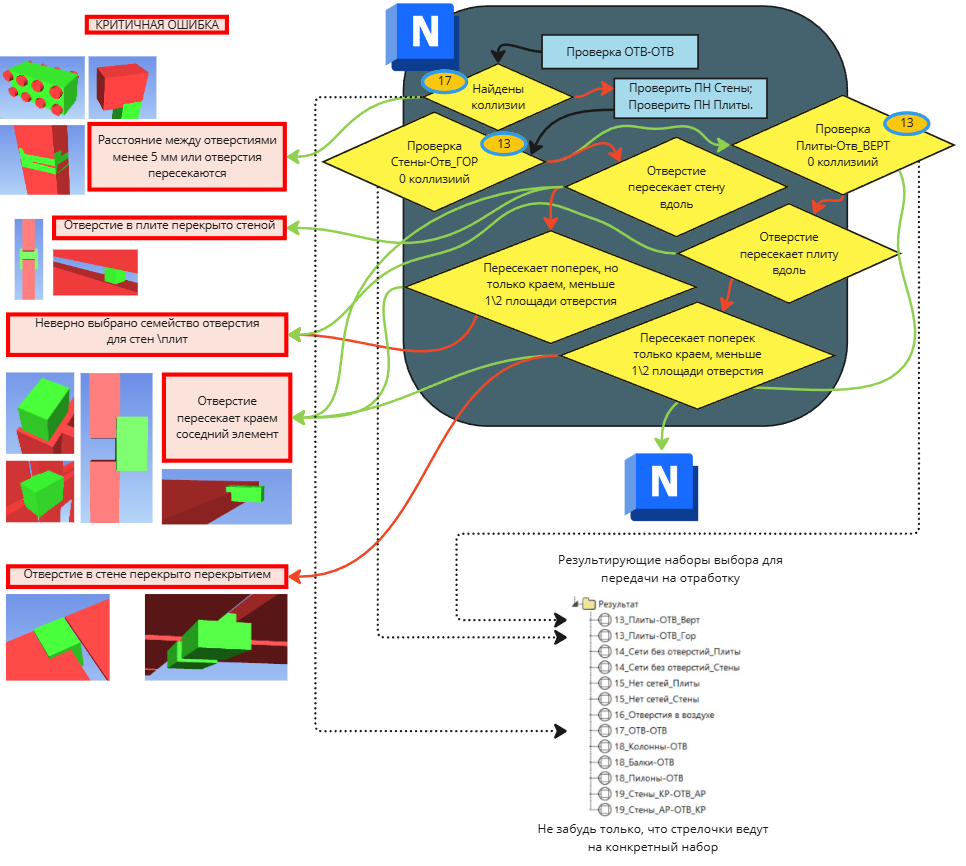 Кроме того, отверстия не должны пересекаться с несущими колоннами, балками и пилонами. Проверки «17_Колонны-ОТВ», «17_Балки-ОТВ» и «17_Пилоны-ОТВ»и следует провести и просмотреть вручную для выявления мест пересечения отверстий с несущими колоннами, балками и пилонами. Исключения составляют закладные гильзы и маленькие отверстия, поэтому лучше обсудить эти случаи с конструктором. Отверстия для раздела АР не должны находиться в стенах КР и наоборот; в противном случае обновляются наборы «18_Стены_КР-ОТВ_АР» и «18_Стены_АР-ОТВ_КР».
