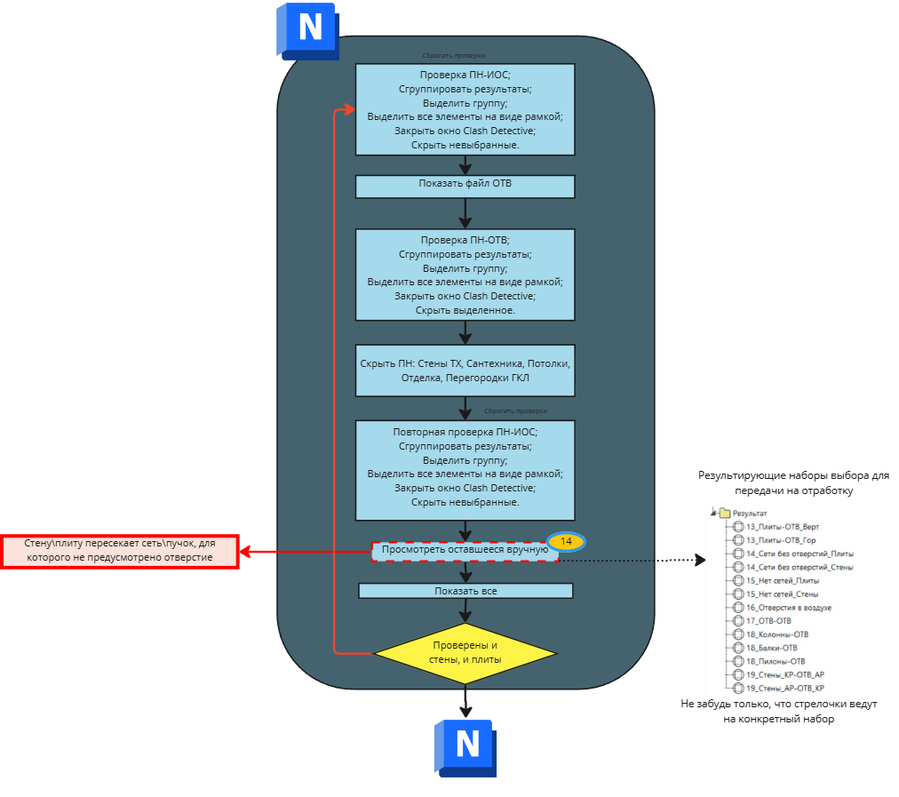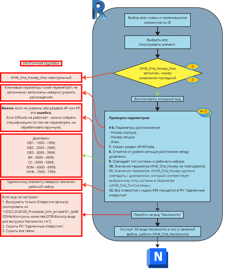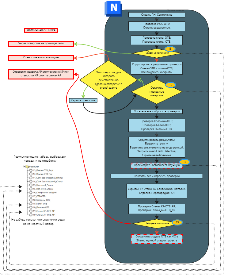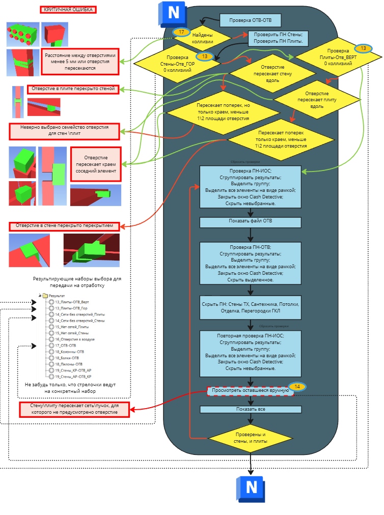 Проверка заданий на отверстия включает обработку файла задания в Signal, Revit и Navisworks. Результаты проверки и замечания фиксируются в отчет проверки модели. Общая схема проверки и условные обозначения представлены ниже.