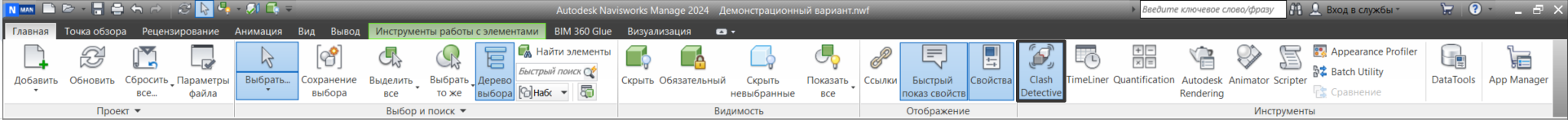- Панель инструментов – панель с инструментами для взаимодействия с моделью (подрезка, clash detective и т.д.);